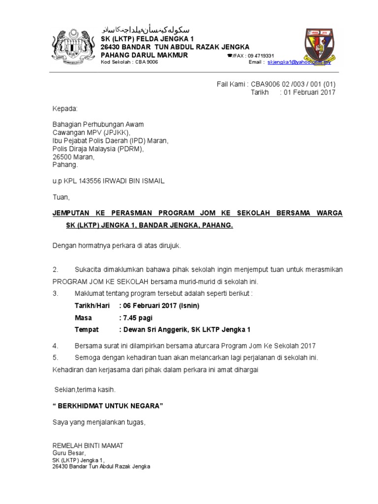 Contoh Surat Rasmi Jemputan Sekolah. Kerjasama ybhg dato seridatotuanpuan menjayakan majlis . Tuan puan jemputan ke majlis perasmian penutup kursus kredibiliti peringkat sekolah dengan sukacitanya. Surat rasmi jemputan sebagai penceramah sekolah motivasi surat. Pastikan alasan kukuh supaya boss boleh terima.
